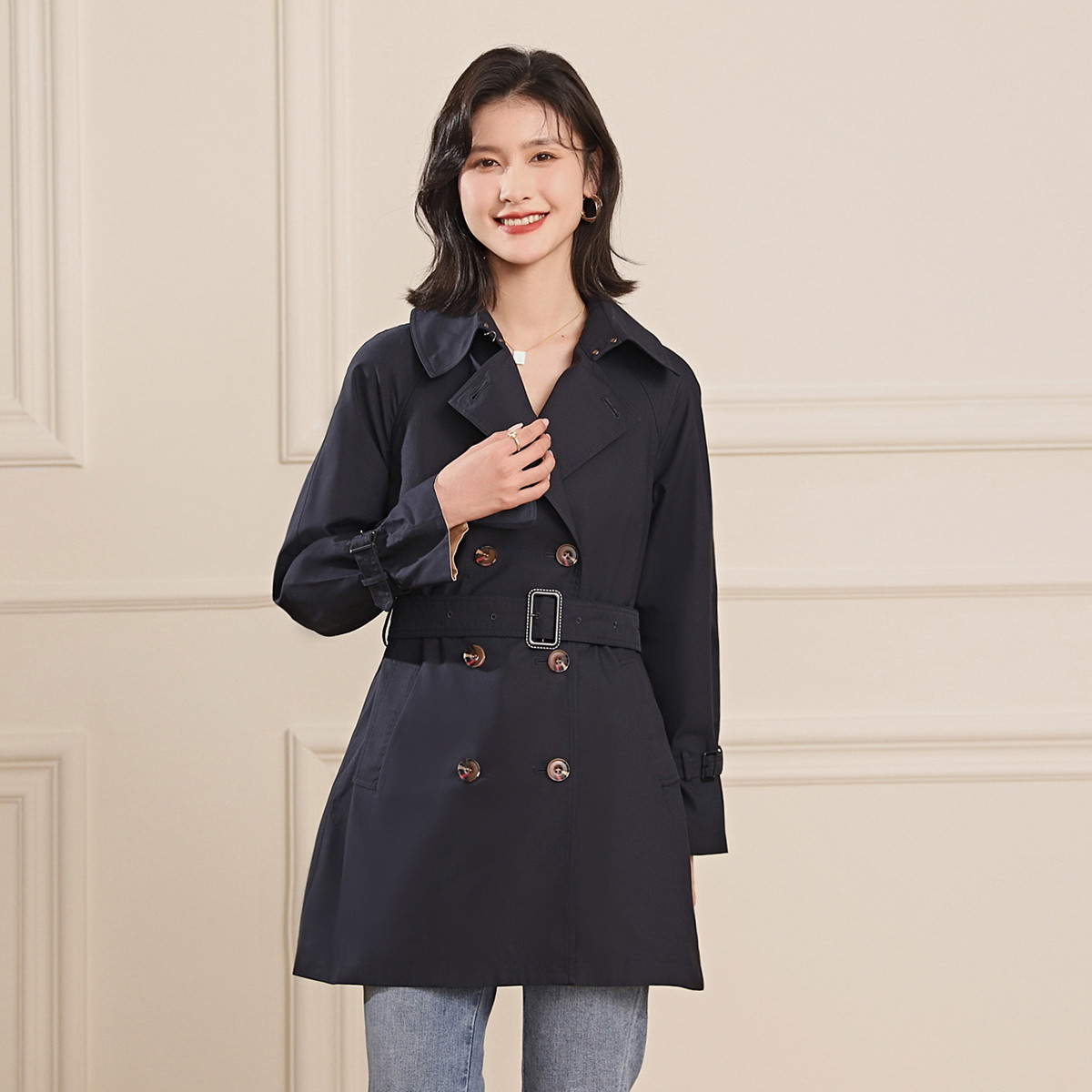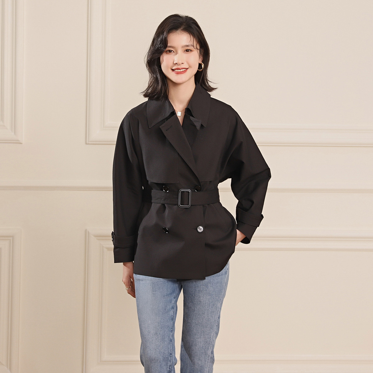春秋新款小个子韩版长袖双排扣短款侧插袋女式系带风衣外套 380127