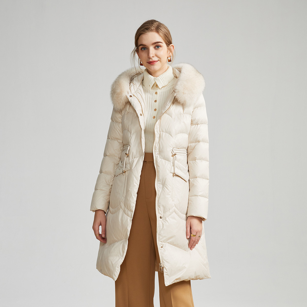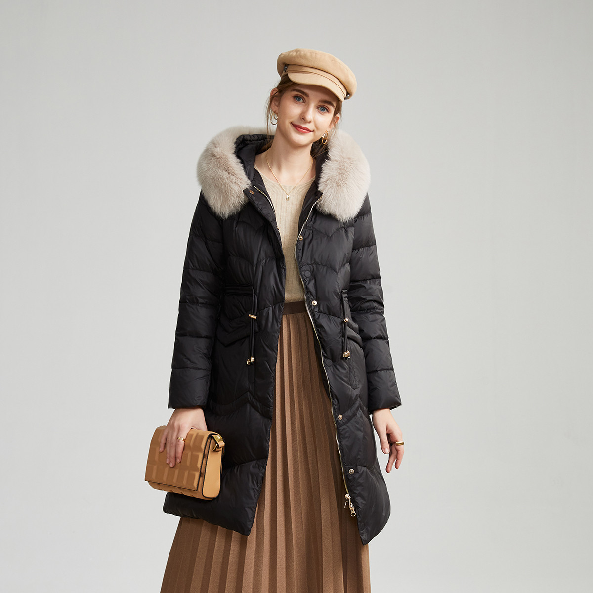 女式防风袖柔软狐狸毛领收腰显瘦长款连帽保暖休闲羽绒服 082015