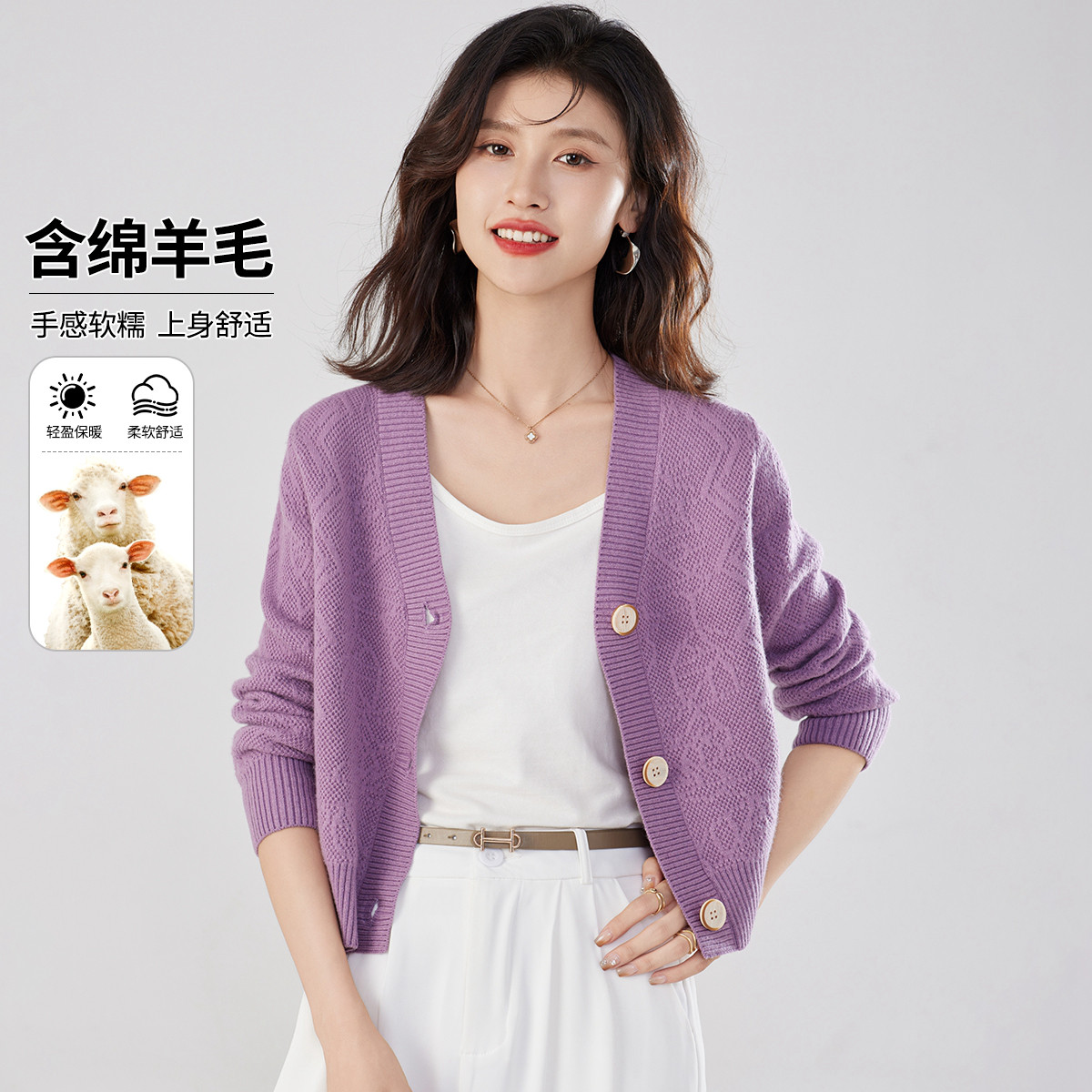 【含羊毛】温柔显白纯色提花针织开衫外套女气质V领针织毛衣外套 233247