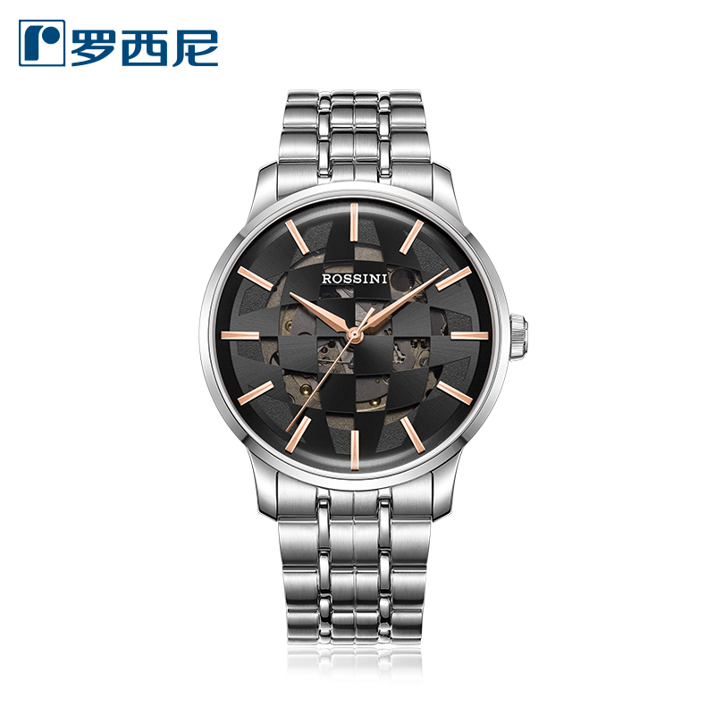 Rossini罗西尼 启迪系列环球腕表 机械手表镂空质感情侣款黑盘钢带男表60027W04B