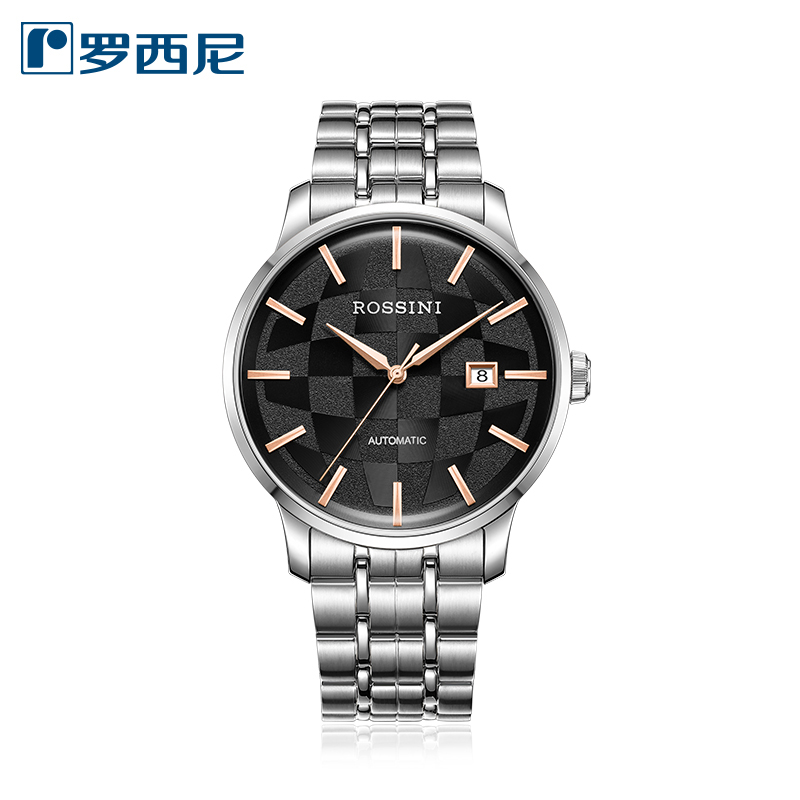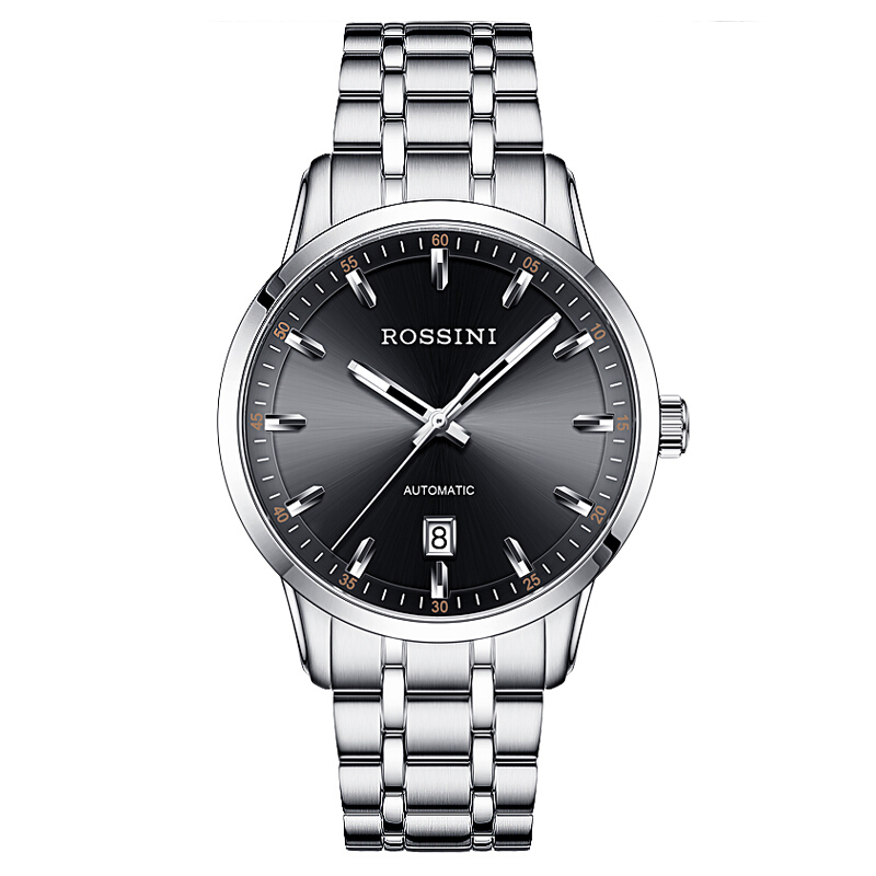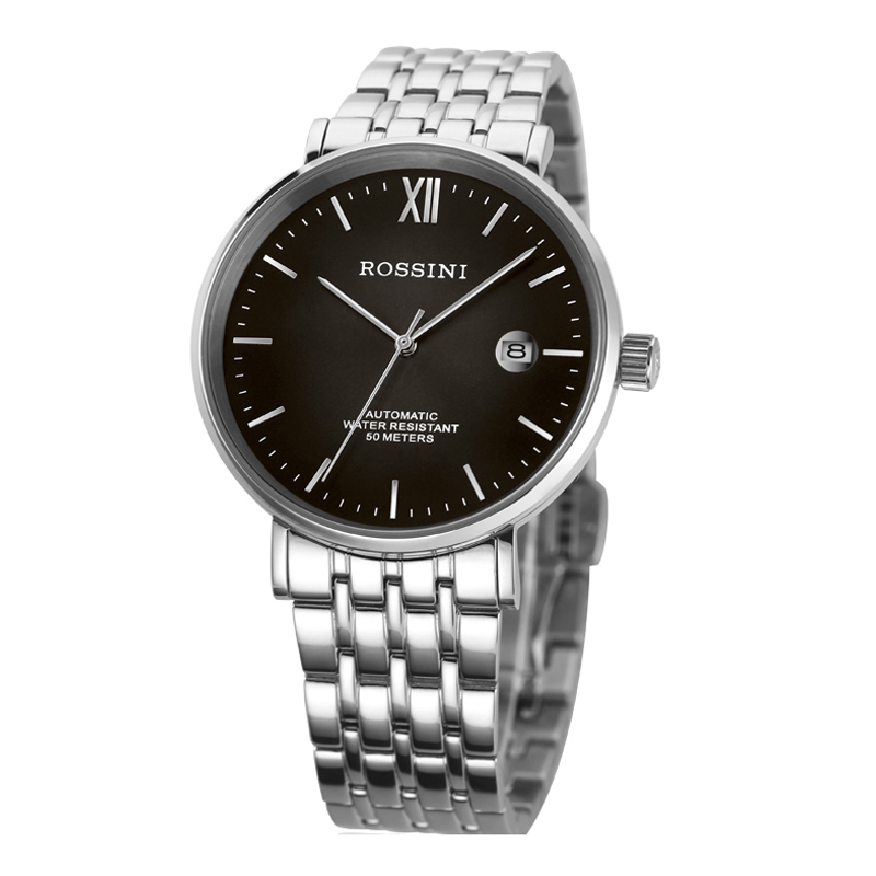 Rossini罗西尼 机械手表商务休闲日历黑盘钢带男表 5827W04B