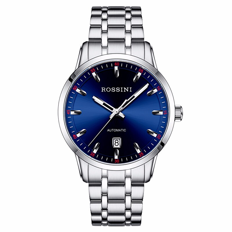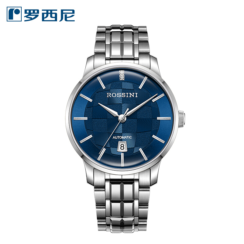 Rossini罗西尼 机械手表商务休闲时尚夜光日历防水情侣款 蓝盘钢带男表50019W05B