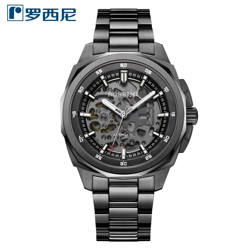 Rossini罗西尼 勋章系列 自动机械手表潮流时尚酷黑镂空黑盘钢带男表 5979B02B