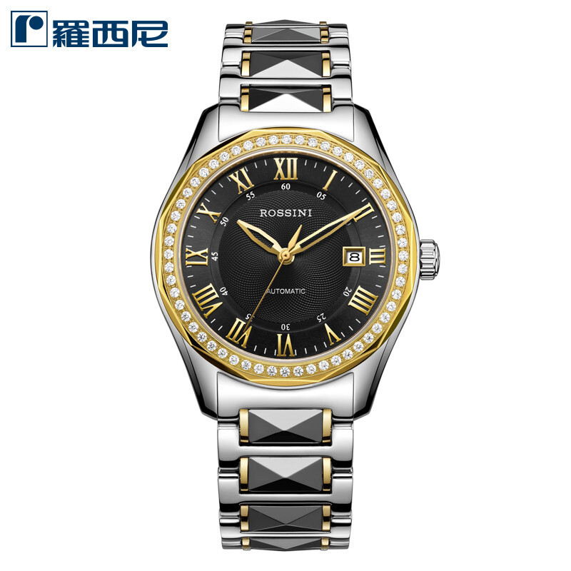Rossini罗西尼 时尚腕表日历镶钻防水自动机械间金黑盘钢带男表6443T04D
