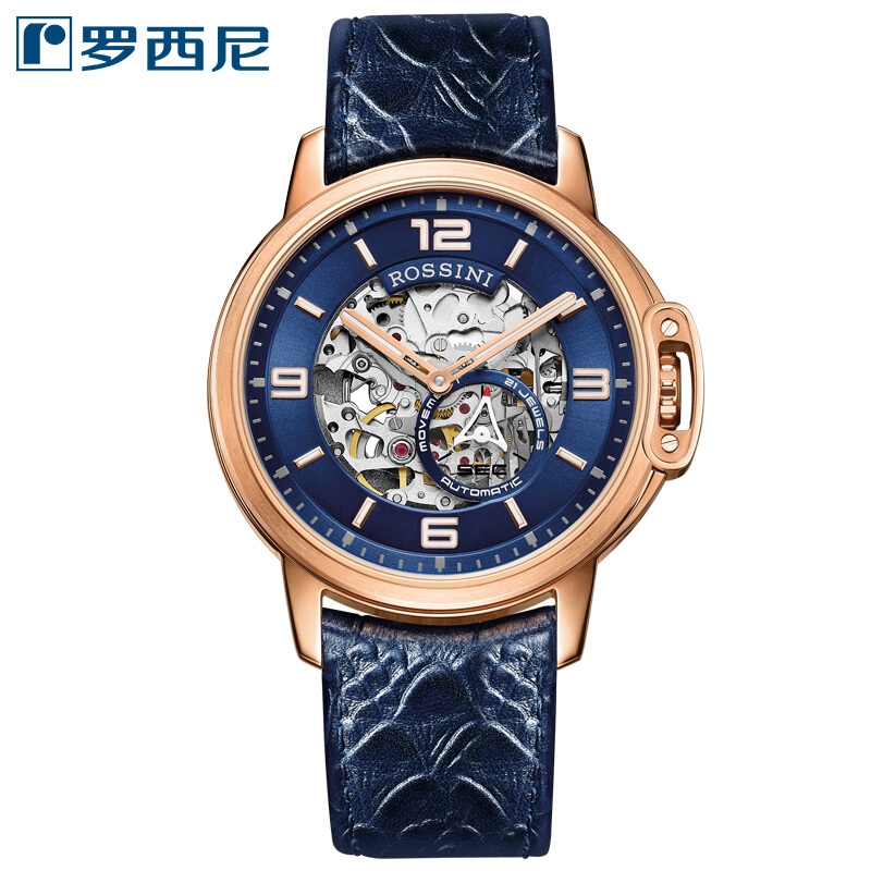 Rossini罗西尼 时尚腕表镂空自动机械男表 蓝盘蓝色皮带 8633G05D