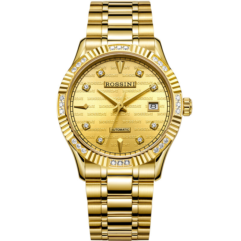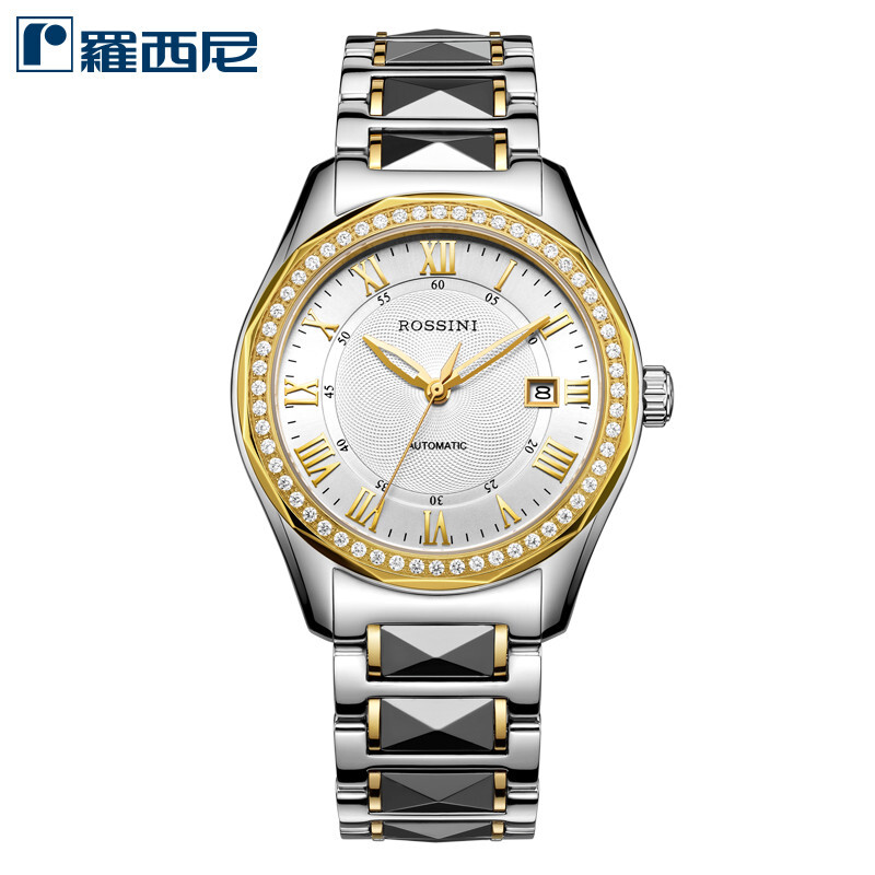 Rossini罗西尼 日历镶钻防水自动机械表商务情侣手表 间金金盘钢带男表 6705G06B