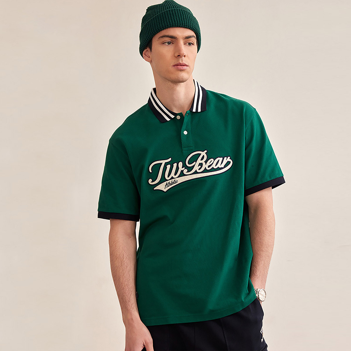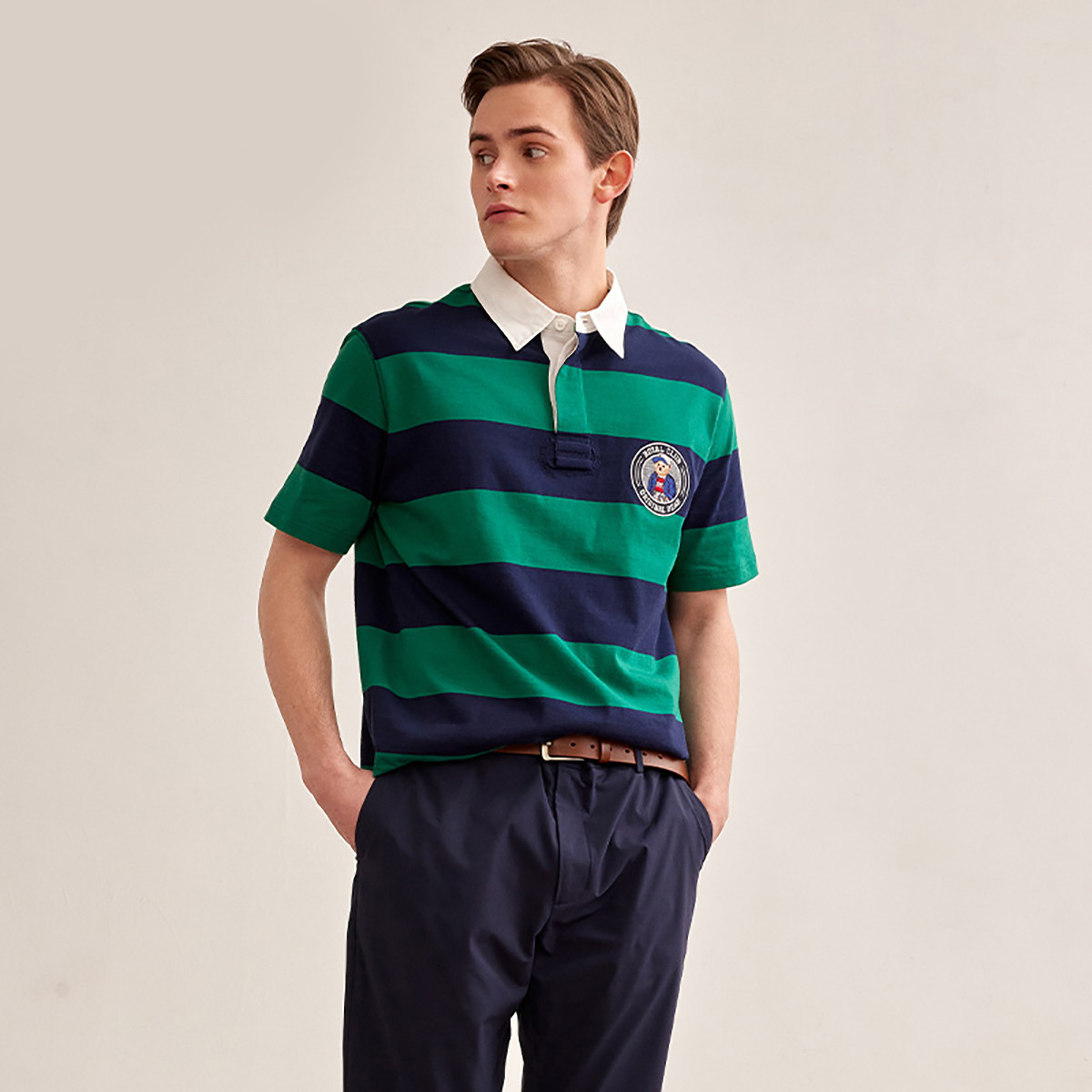 小熊男POLO衫夏季美式复古学院撞色条纹翻领休闲polo衫男 892609