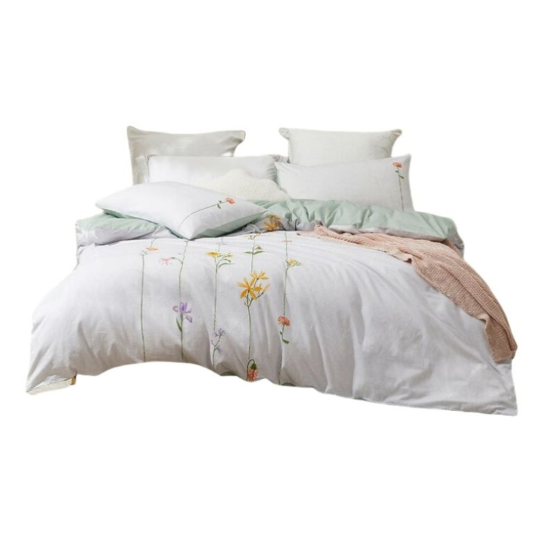 品格家纺 高支全棉宽边刺绣床上四件套 奶昔白+果绿(适用于1.5米-1.8米床铺)