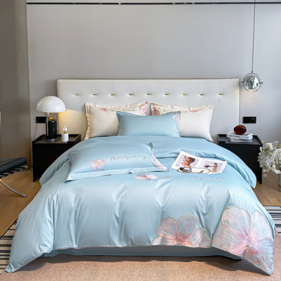 品格家纺 全棉绣花轻奢床上四件套 锦绣花语-蓝(适用于1.5米-1.8米床铺)