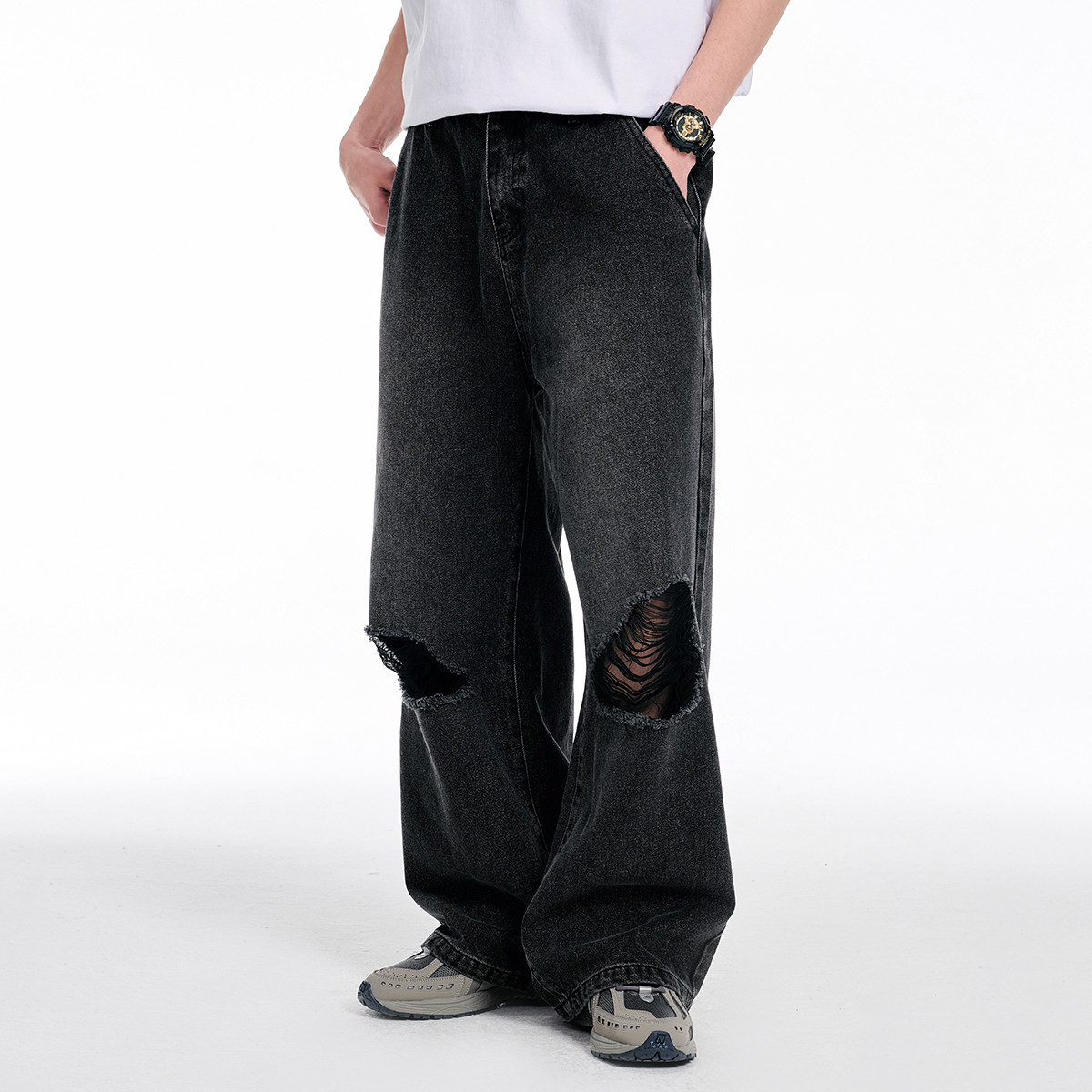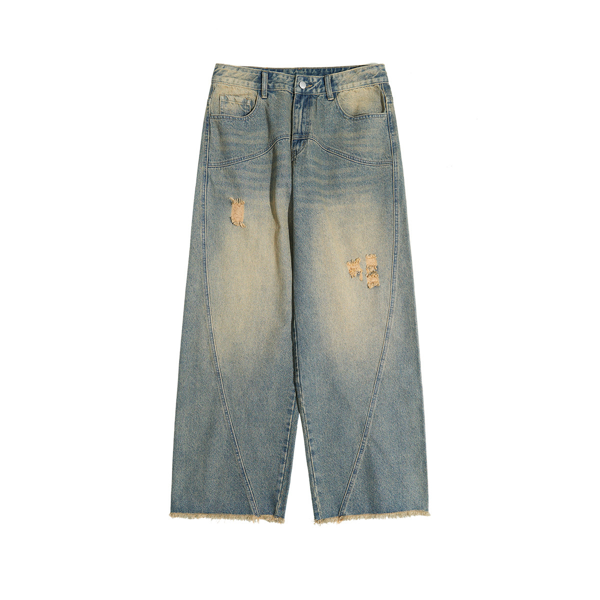 江南先生美式复古水洗做旧破洞毛边牛仔裤男女国潮宽松休闲阔腿裤 752785