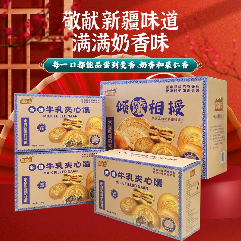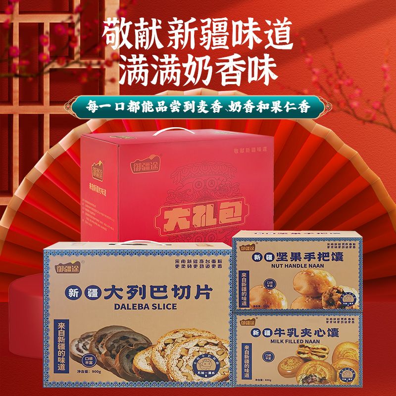 御疆途 新疆倾囊相授礼盒S(1400g)(软软牛乳囊500g+玫瑰夹心馕400g+坚果手把馕500g)
