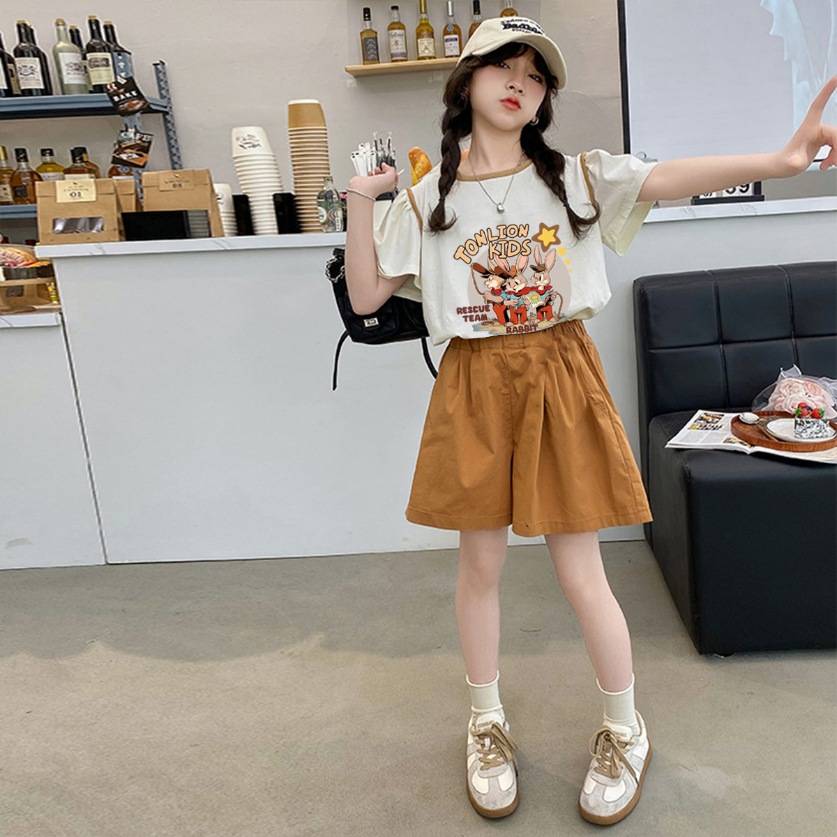 【纯棉吸汗】女童T恤春秋时尚儿童短袖衫中大童落肩短袖T恤上衣 002639