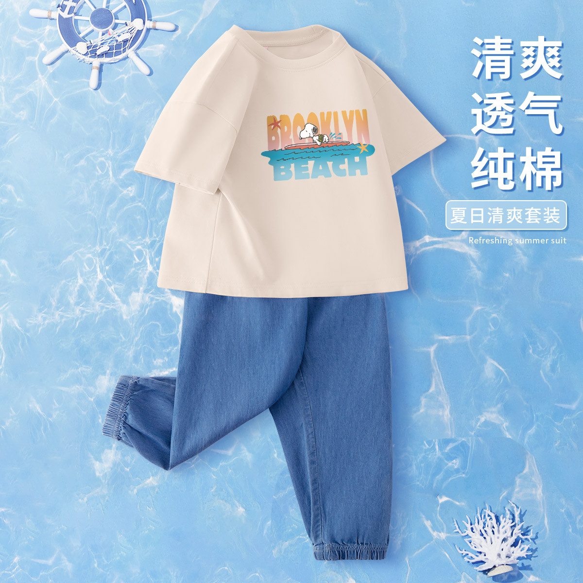 男童短袖t恤男大童休闲运动服小男孩薄款仿牛仔裤子儿童夏季套装 583007