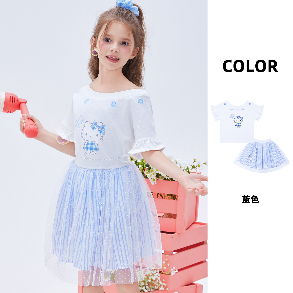 女童夏季套装2025款中大童装卡通印花洋气上衣网纱裙两件套装 592542