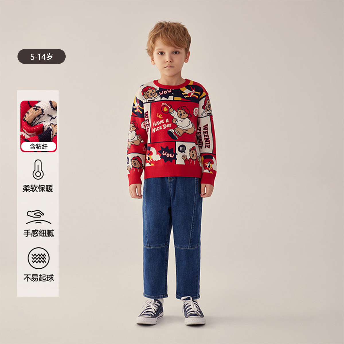 小熊童装春款男童卡通圆领红色长袖毛衣 895425