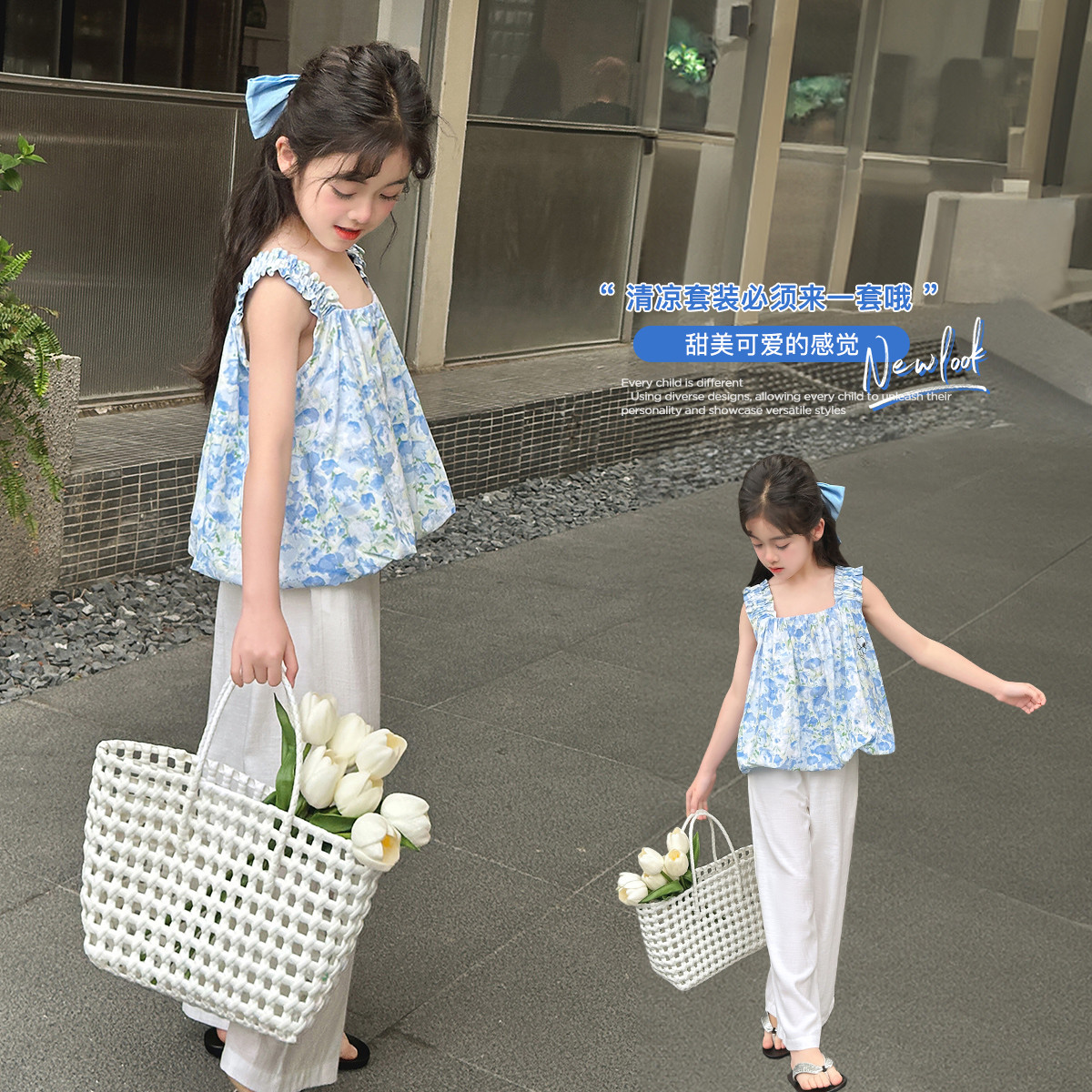 【田园风吊带套装】2025年夏季新品碎花上衣阔腿裤女童套装 757848
