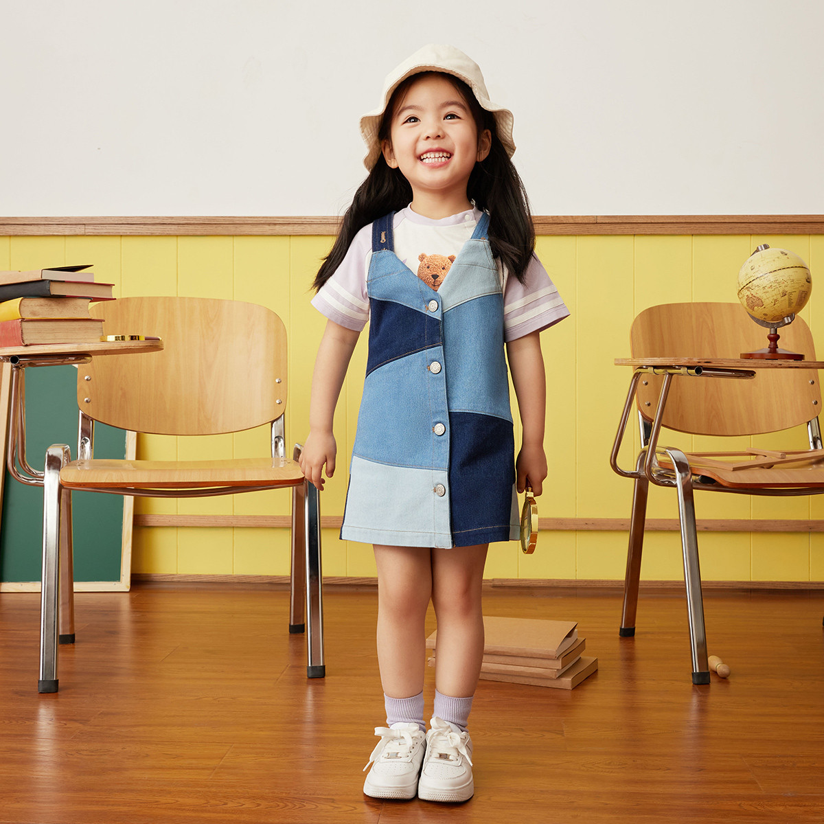 Gap女幼童2024春秋季撞色拼接牛仔背带裙儿童装连衣裙890346 499738