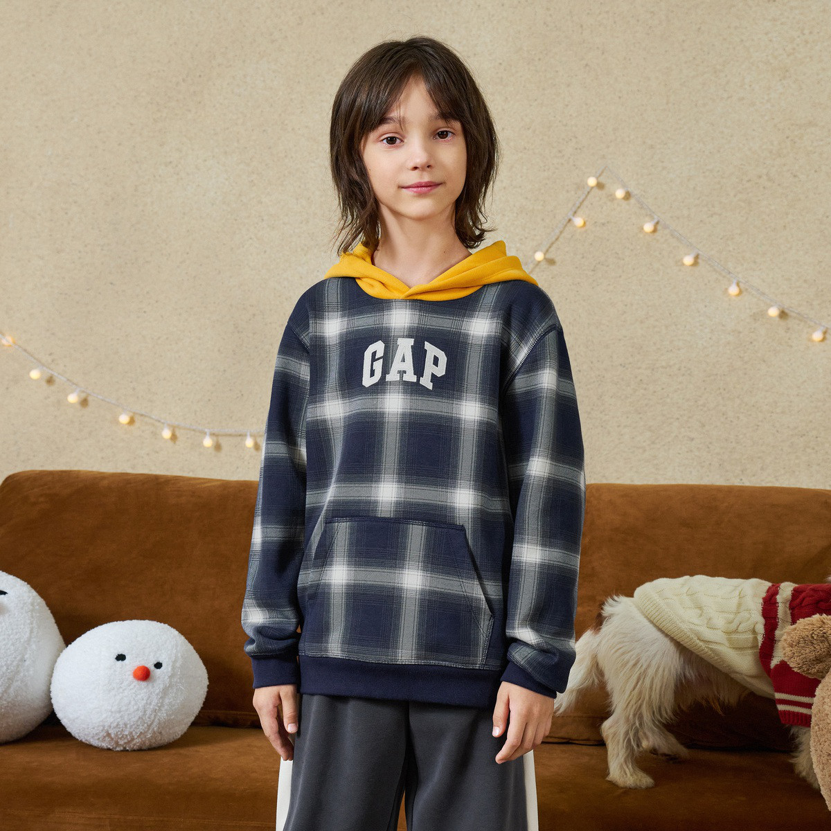 Gap男童冬季LOGO碳素软磨抓绒保暖卫衣休闲格纹运动连帽衫836849 619546