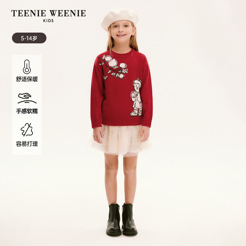 小熊童装红色春季款女童提花圆领套头针织毛衣 519745