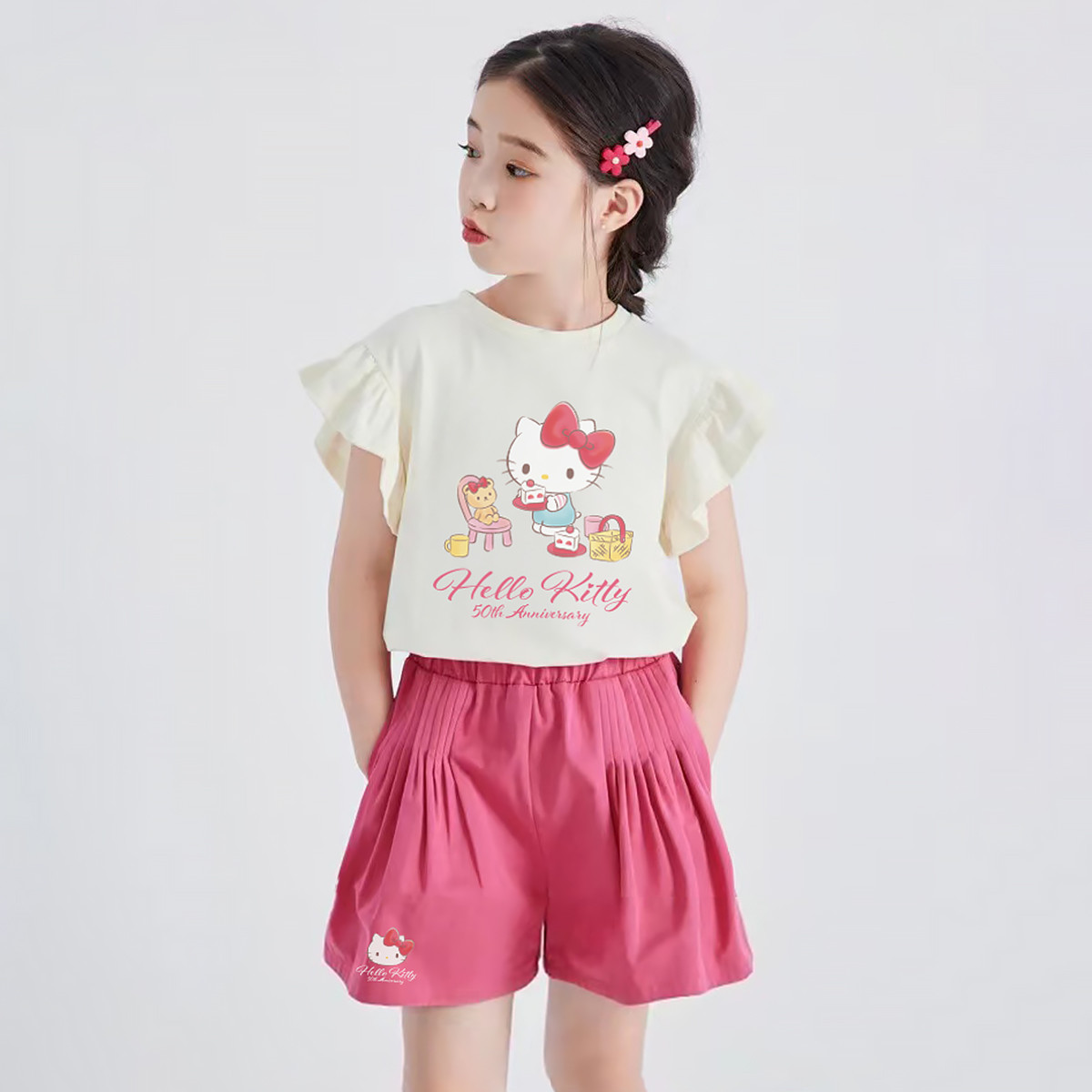 女童夏季套装2025款荷叶边袖口T恤+特色压褶裙裤卡通两件套 572510