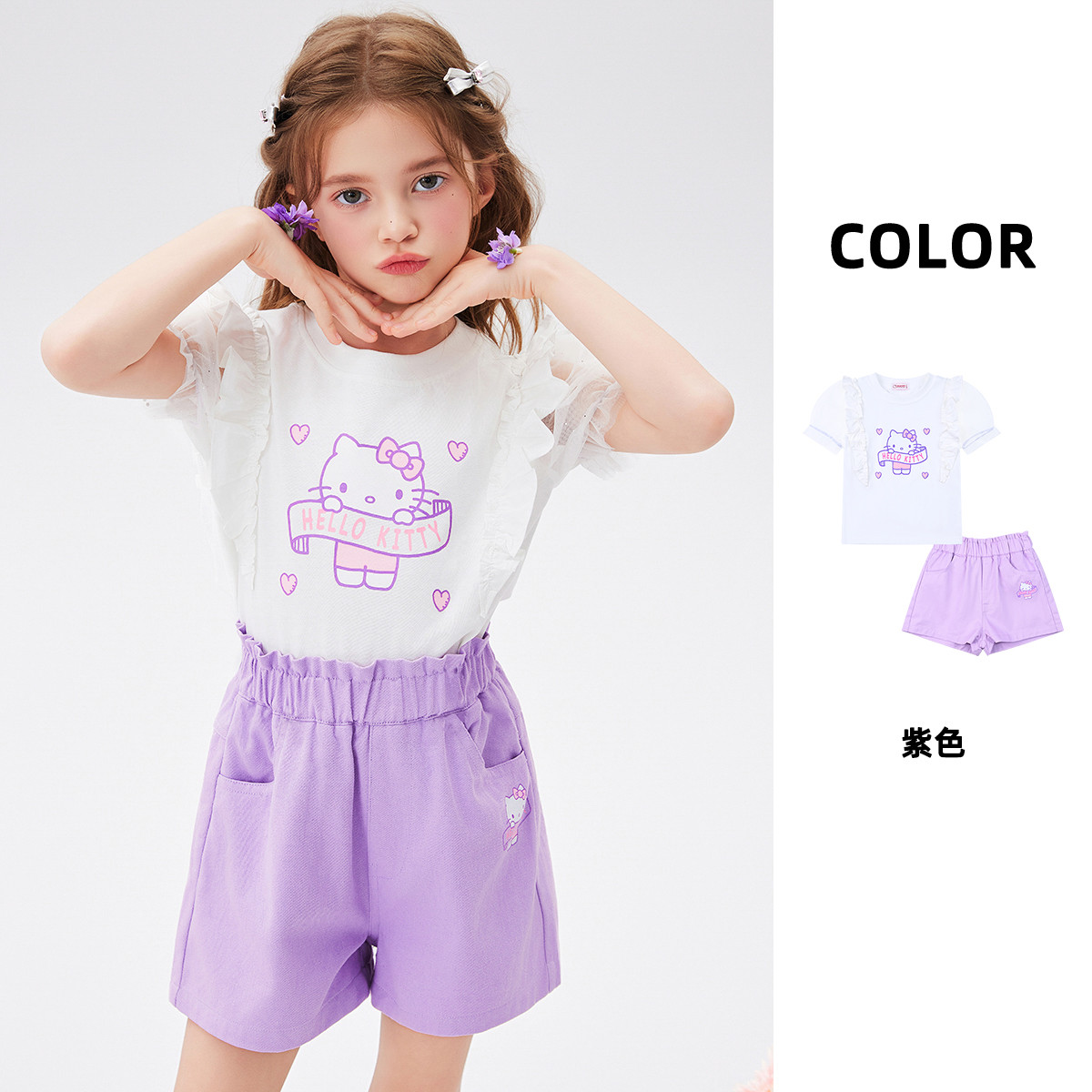 女童夏季套装2025款木耳边泡泡袖上衣舒适弹力裤子卡通两件套 629854