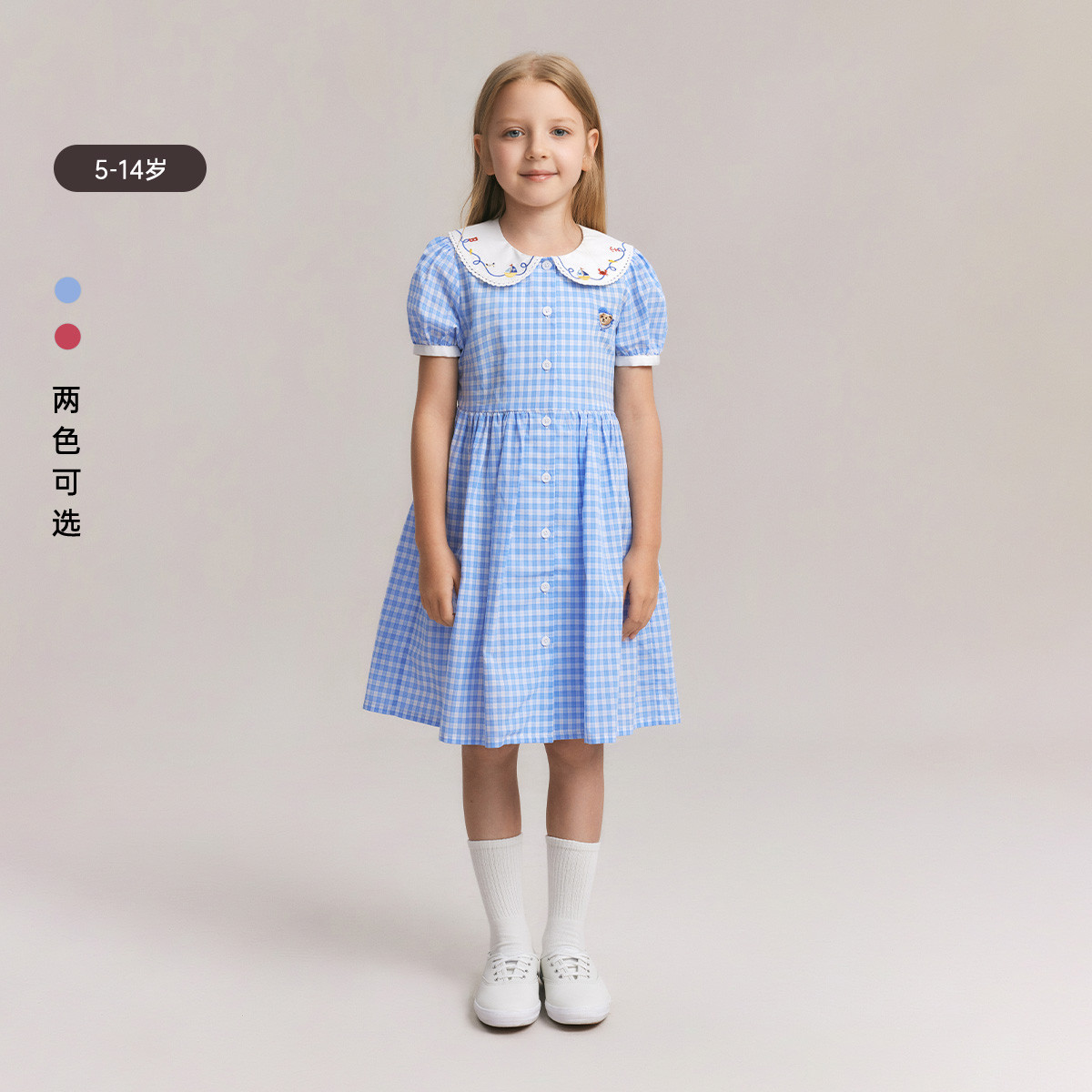 小熊童装夏季女童清爽翻领格纹连衣裙 542721