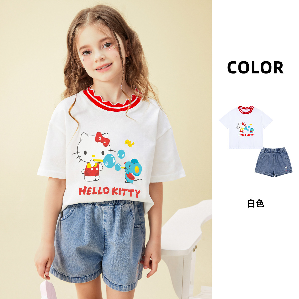 女童夏季中大童套装2025款【撞色波浪纹领子上衣+牛仔短裤】 912158
