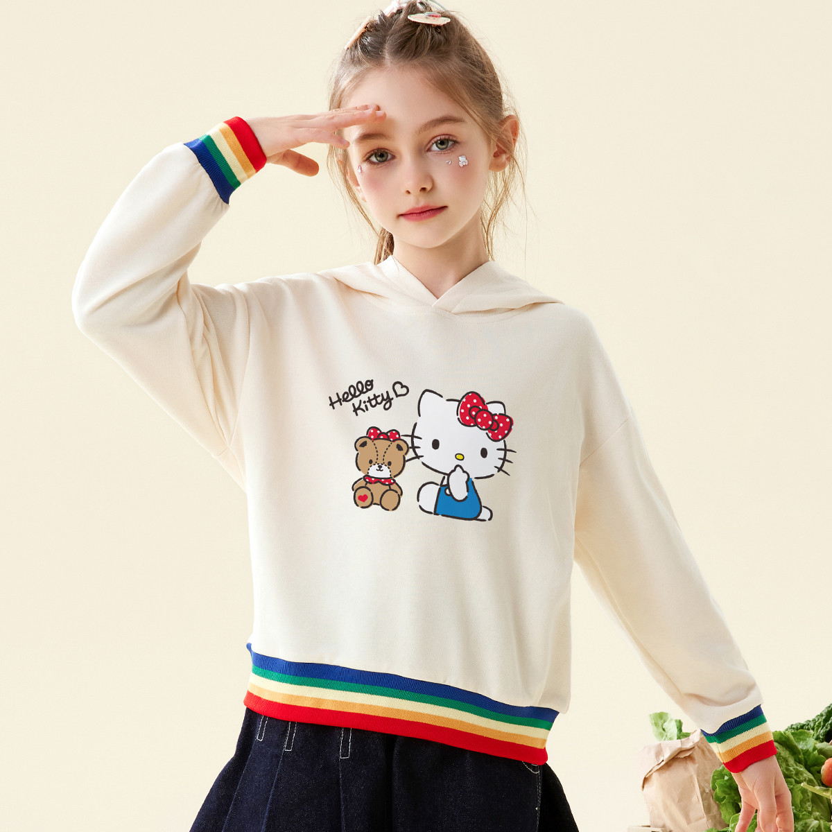 【日常推荐】2025年春季女童连帽长袖卫衣中大童彩虹袖口上衣 802334