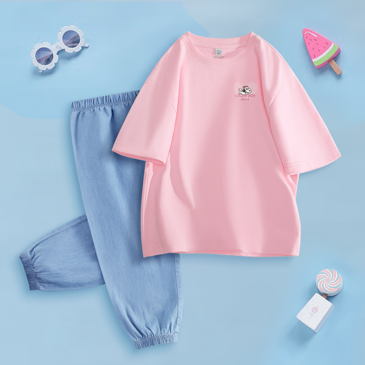 女童套装25年夏季纯棉短袖t恤中大童仿牛仔裤儿童运动两件套薄 119071