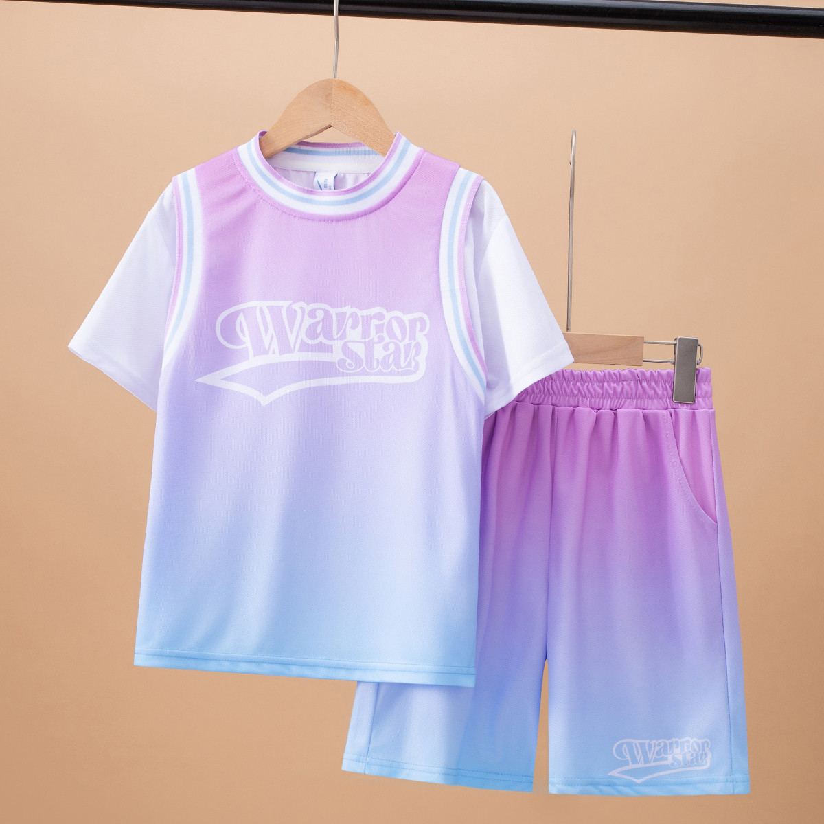 童装男童时尚渐变篮球服套装夏季中大童假两件短袖短裤两件套潮 658835