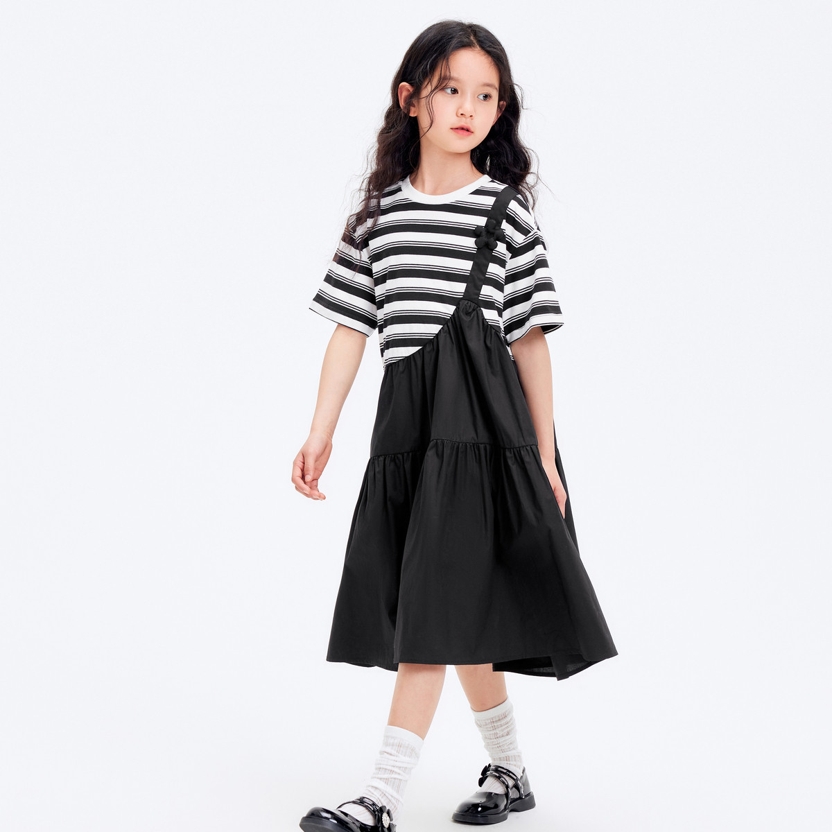 学院风条纹拼接假两件女童连衣裙夏薄款大童裙子T恤裙甜美高级感 985861