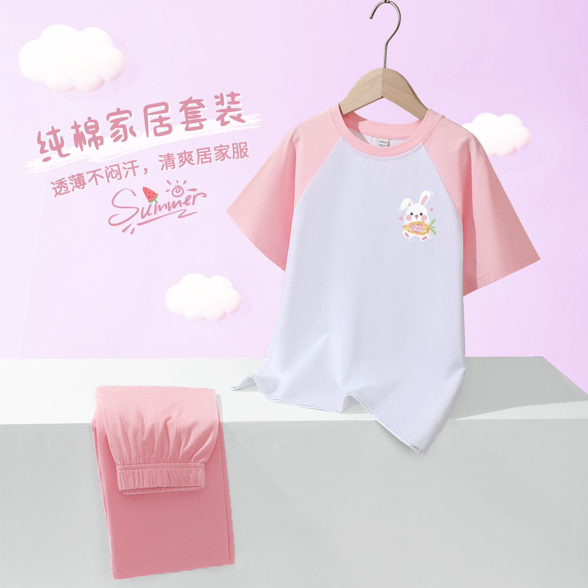 女童夏季睡衣儿童短袖短裤套装25年夏中大童洋气兔子纯棉家居服 321491
