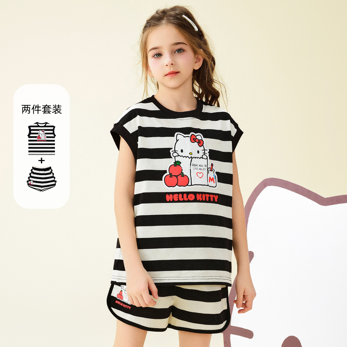 【黑白条纹夏日套装】2025款中大女童夏季卡通上衣裤子两件套 751710