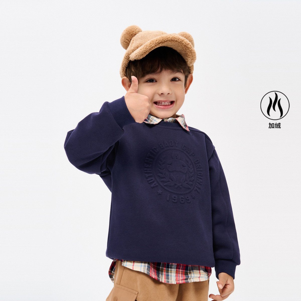 Gap男幼春秋LOGO立体宽松加绒保暖运动卫衣儿童装上衣837023 910490
