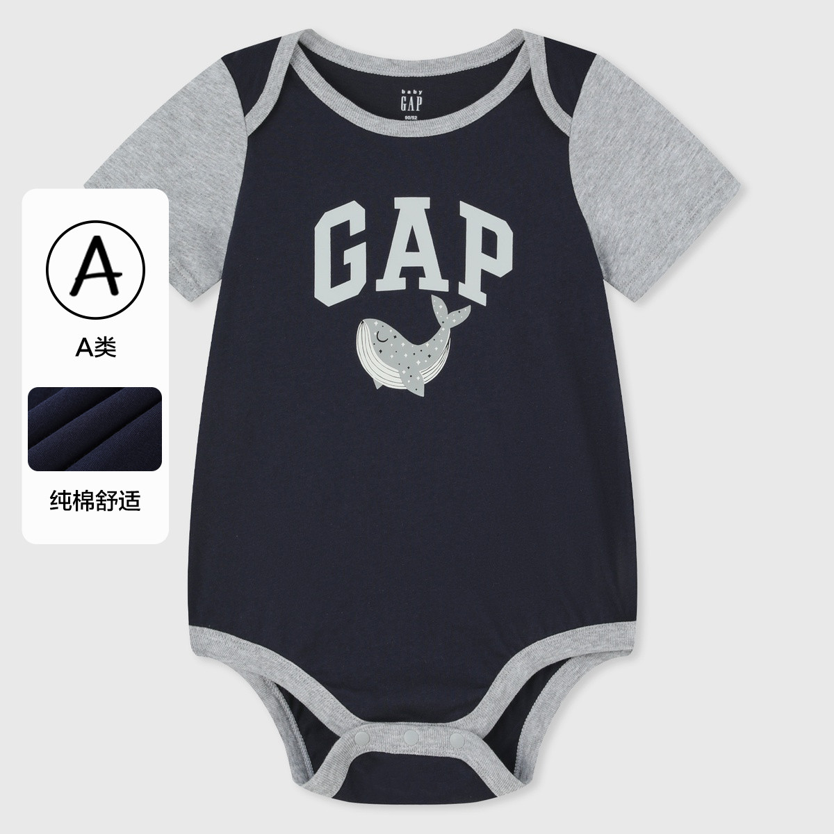 Gap婴儿2024春秋季logo撞色纯棉短袖连体衣儿童装包屁衣505583 485338