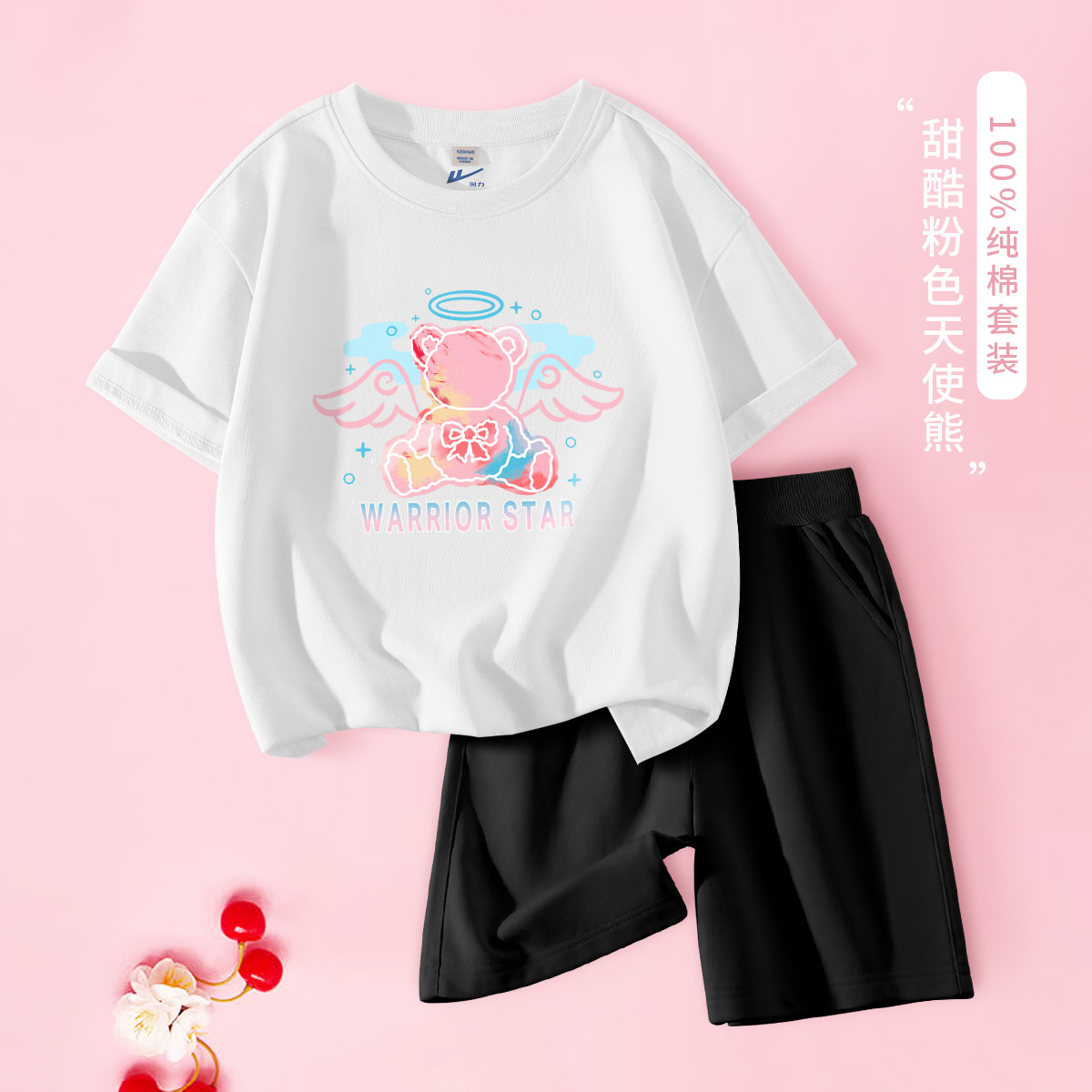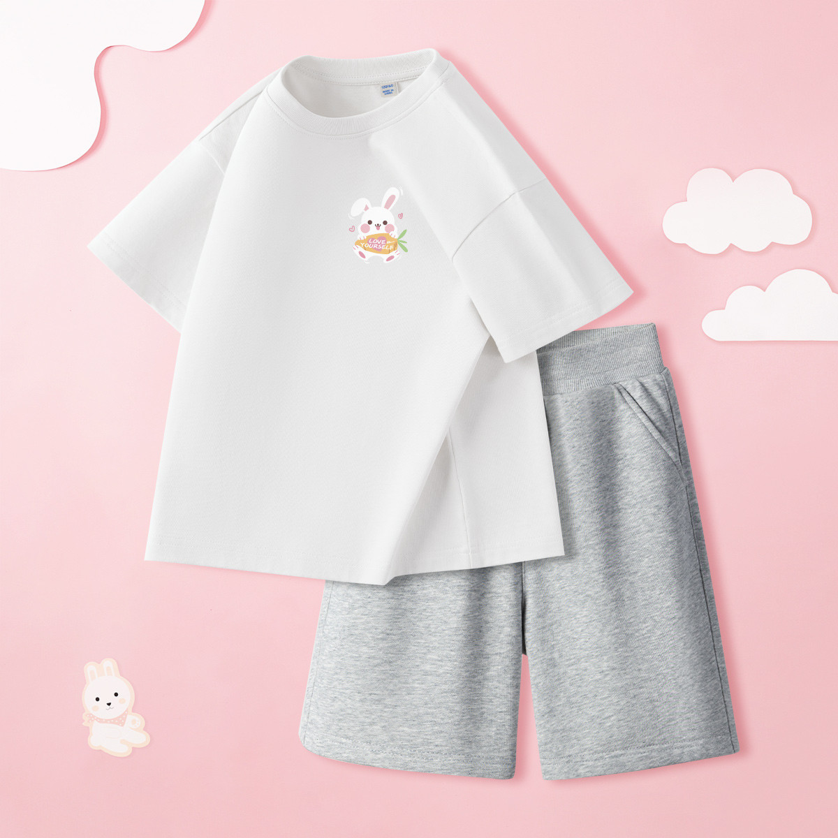 儿童运动套装女孩网红炸街纯棉短袖25年夏季女童兔子印花两件套 516435