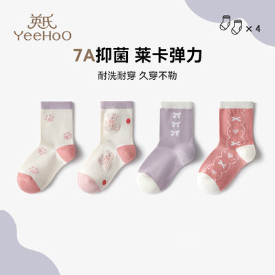 英氏(Yeehoo)四季款棉质袜子【7A抑菌4双装】女童领结小熊 M码