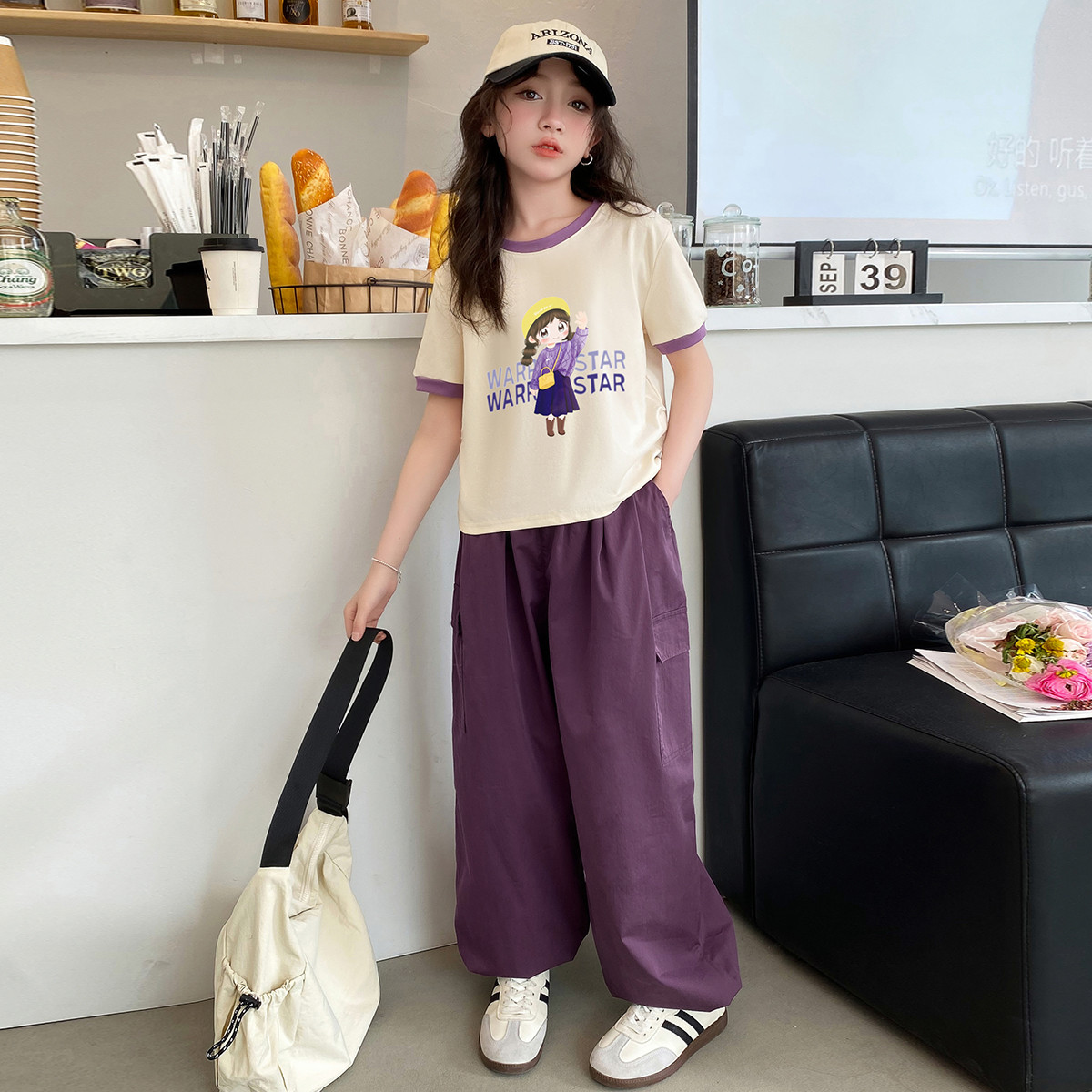 童装女童休闲套装24夏季中大童时尚洋气卡通短袖长裤两件套 472211
