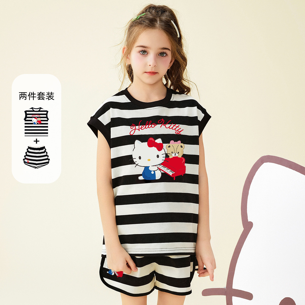 【黑白条纹夏日套装】2025款中大女童夏季卡通上衣裤子两件套 591966