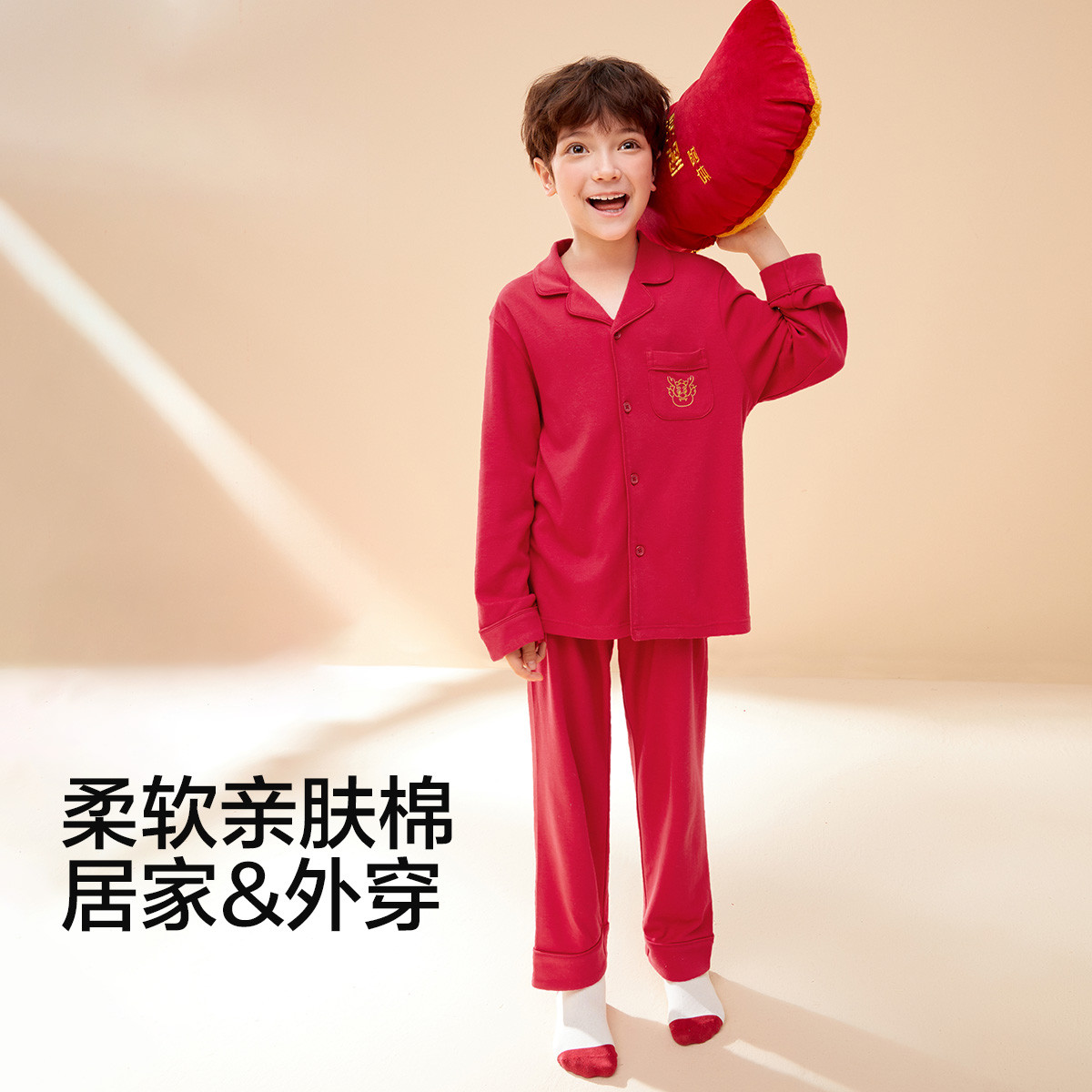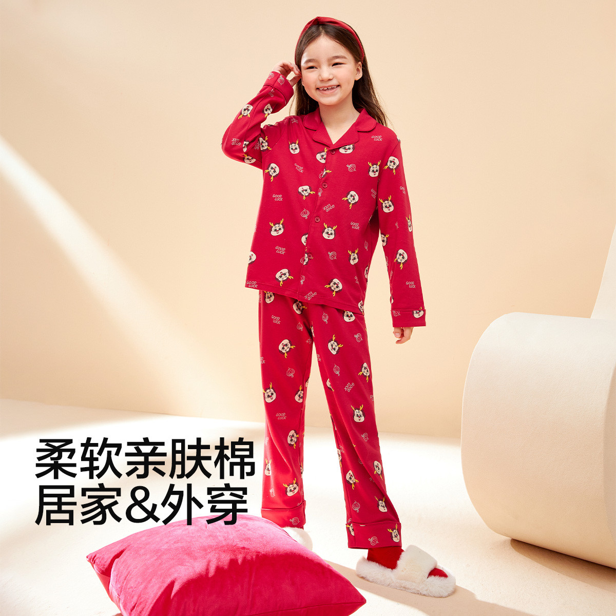 儿童睡衣套装男童女童家居服棉春秋季红色长袖套装可外穿亲子装 715141
