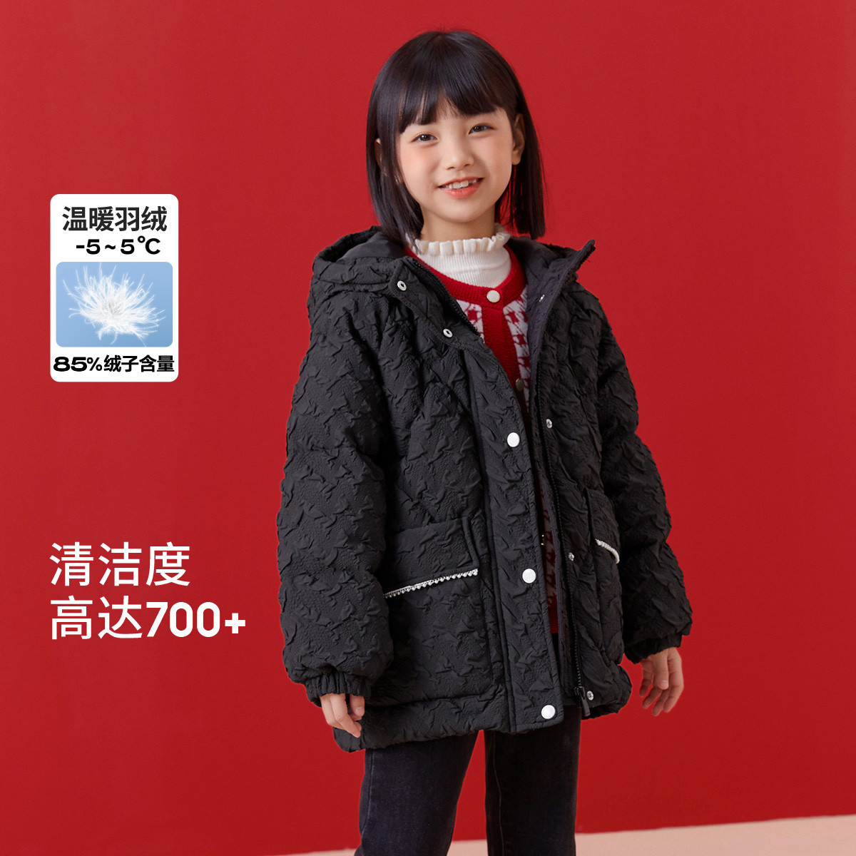 肌理面料儿童羽绒服春装女童保暖红色中长款连帽外套童装上衣大童 968773