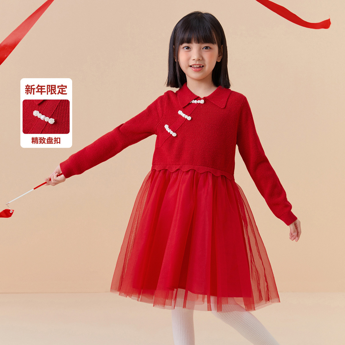 新中式国风裙子女童网纱连衣裙儿童春秋款大童红色裙子精致小盘扣 856901
