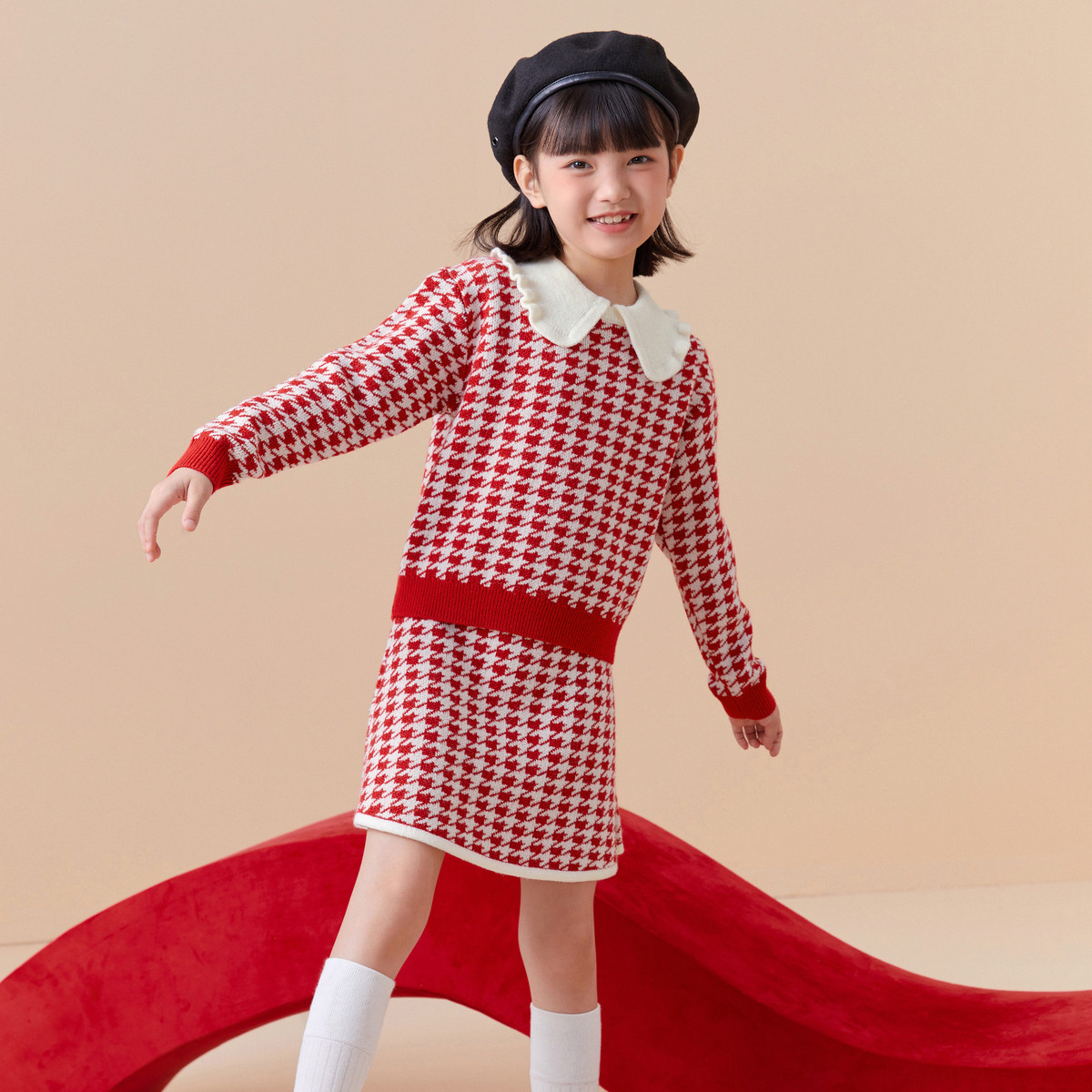 千鸟格女童套装春秋装儿童红色洋气童装时尚两件套国风新中式 301125