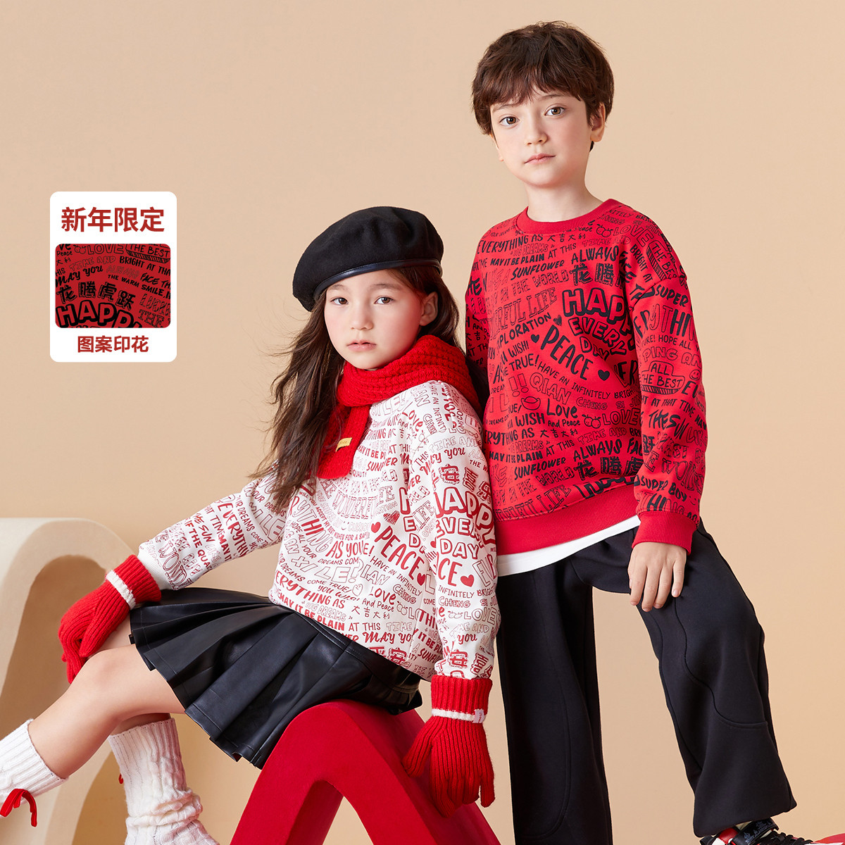 国风印花儿童卫衣男童女童春秋装圆领童装上衣红色套头衫 697477