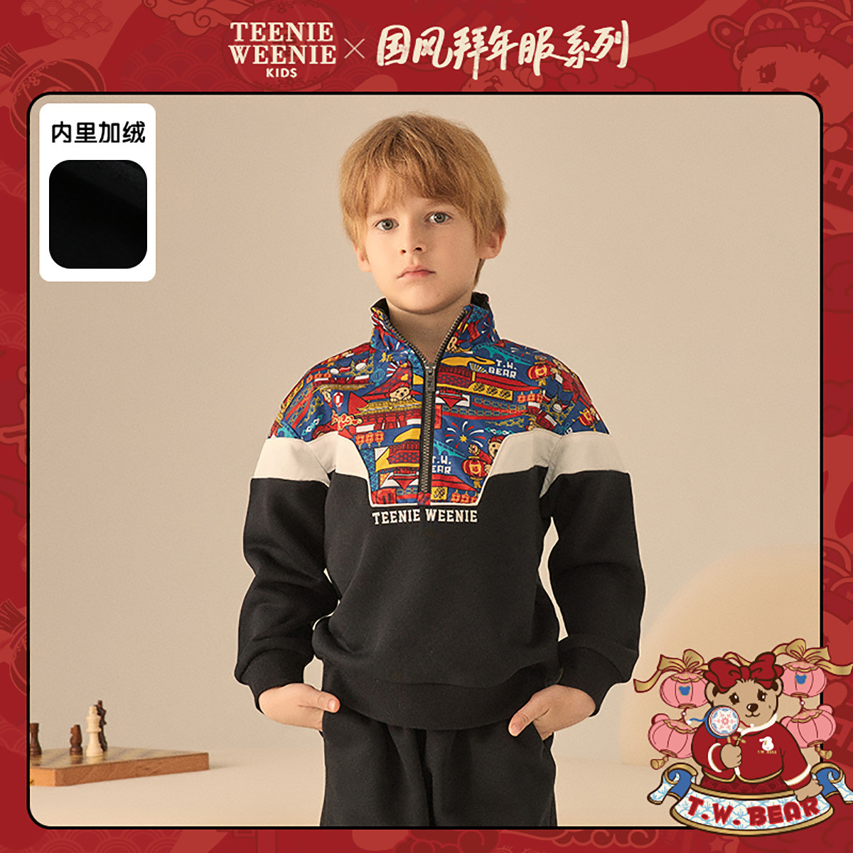 【国风】小熊童装男童春季拉链polo领中国红卫衣 463041