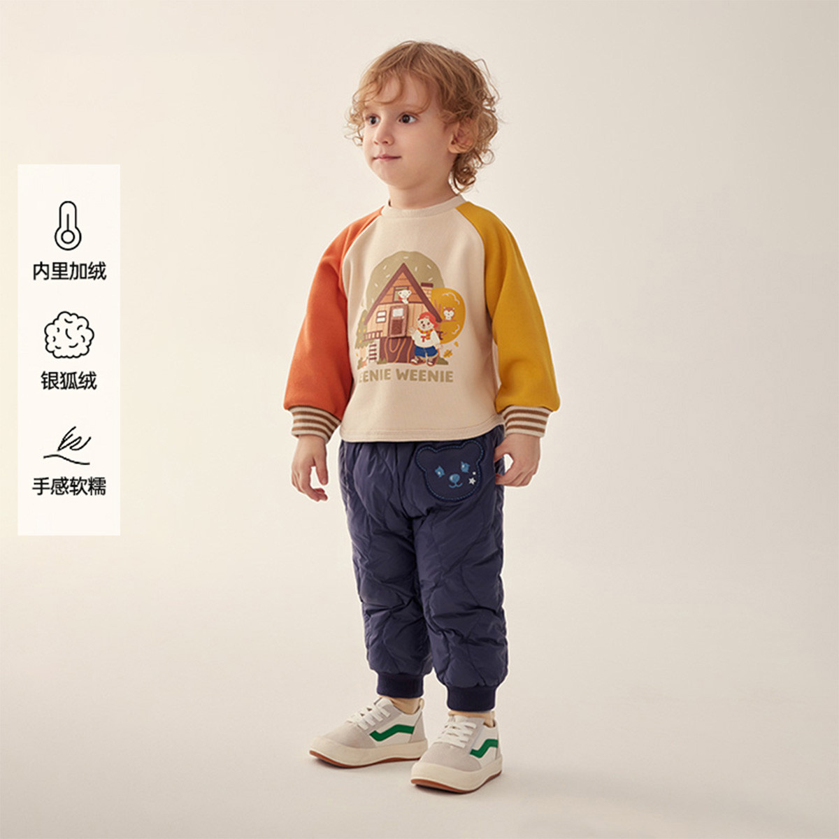 小熊童装春季男宝宝撞色银狐绒套头卫衣 724097