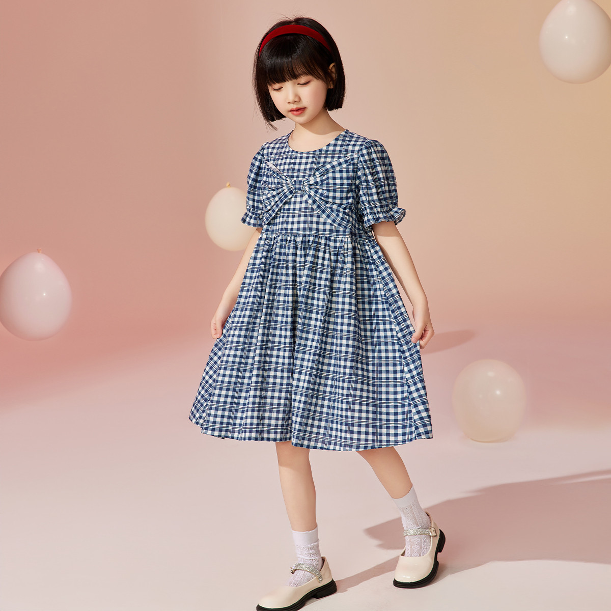 小熊童装女童洋气格纹印花连衣裙 498497