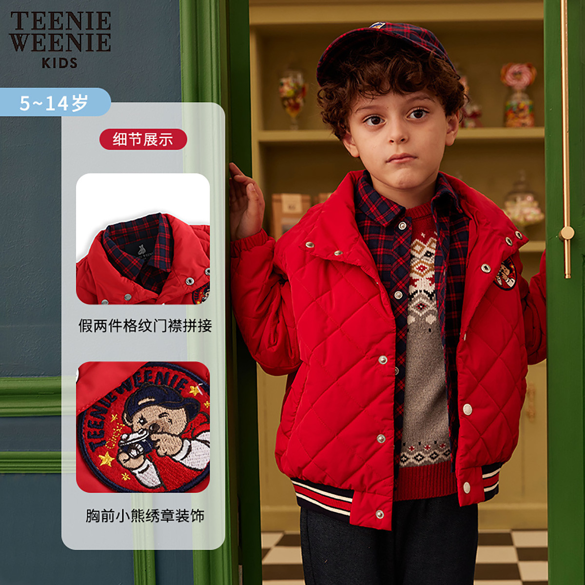 小熊童装红色男童秋假两件格纹拼接绣章外套 124481