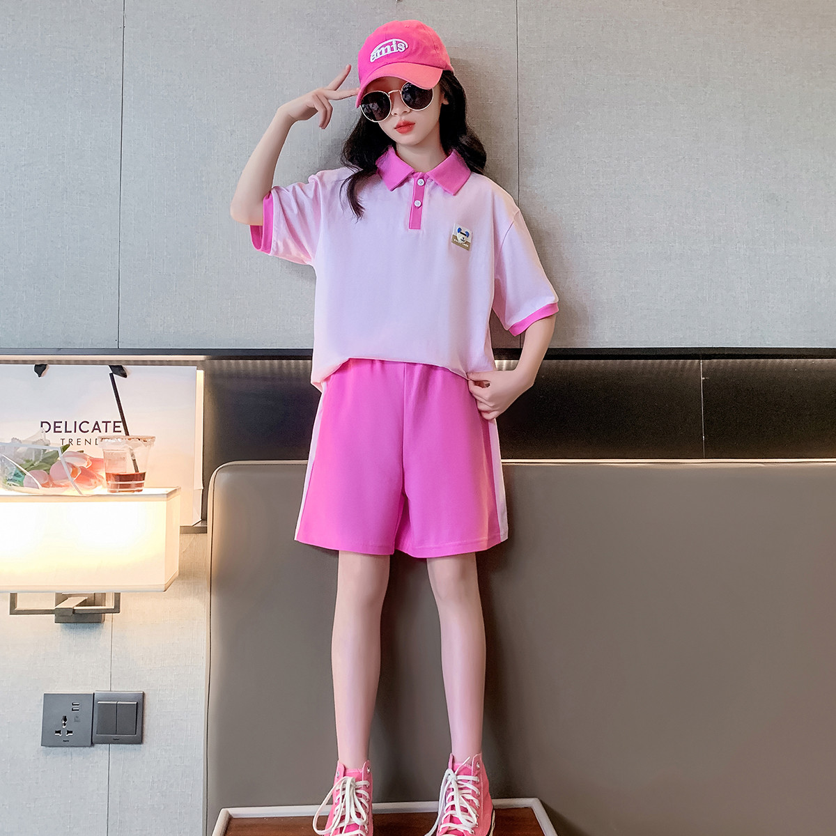 夏款洋气女童运动风套装中大童装休闲套装翻领短袖加短裤套装潮 771471