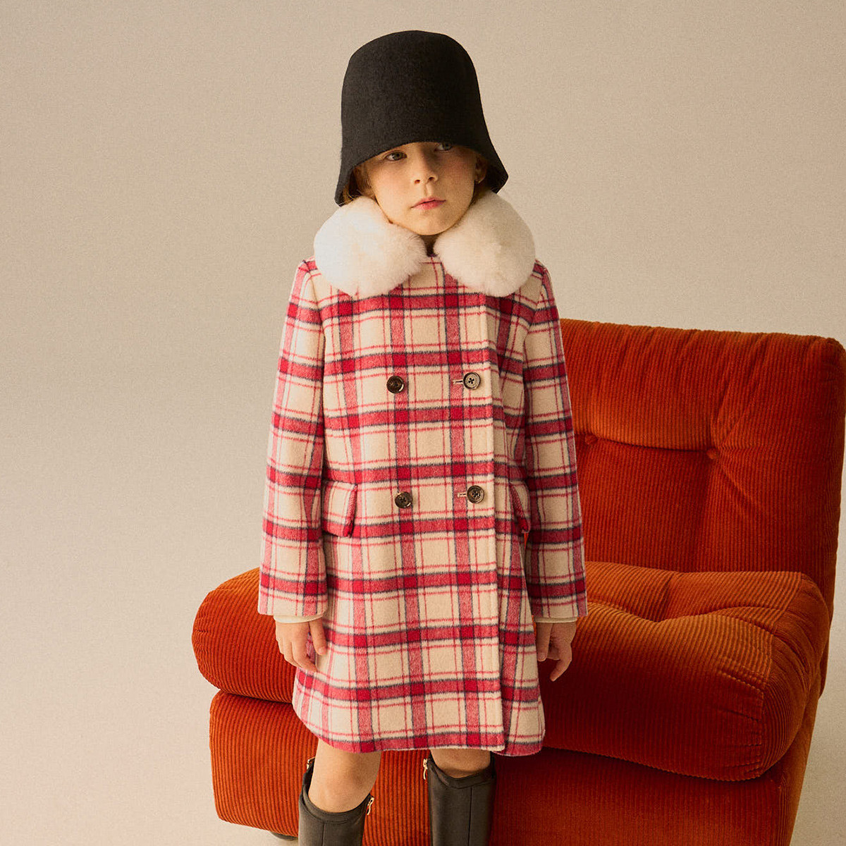 小熊童装红色女童春款季洋气格纹毛呢大衣 528257